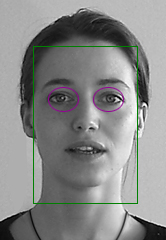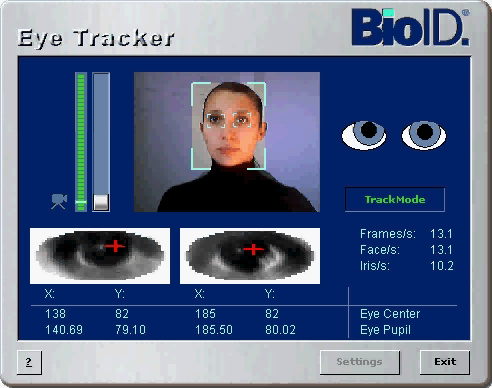 ![]() 登録された人の瞳の距離、輪郭に対する目の位置を瞬時 に割出PCにデータを転送登録データベースと照会します。 |