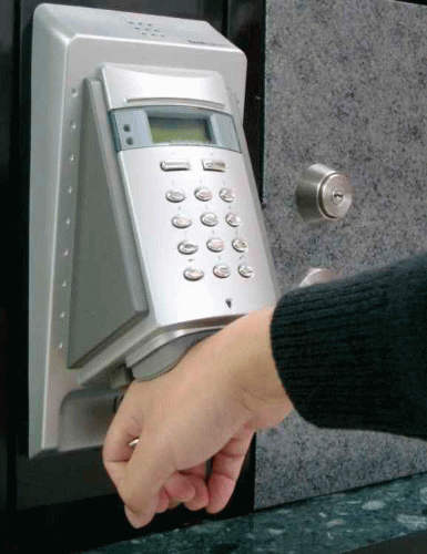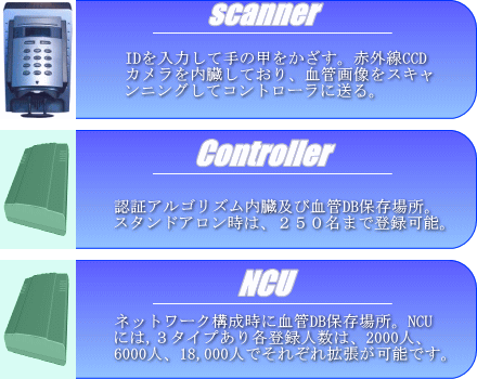 | 本人認識部 | 手の甲の静脈パターンを赤外線技術、CCDカメラ、高帯域フィルタリング技術そして静脈パターン抽出技術を複合させ、誤認識率を0,0001%という精度にまで高めた生体認識装置です。